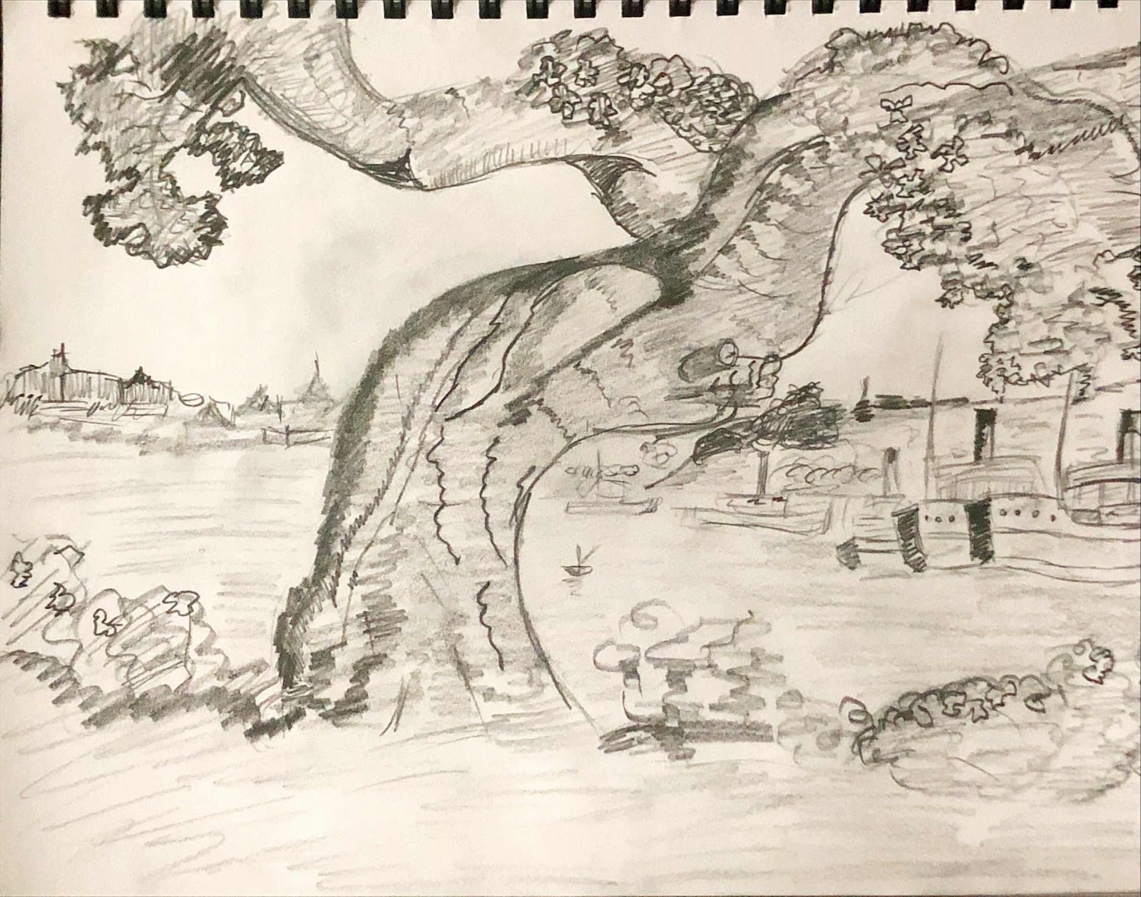 had given me a nice sketching pad and some decent pencils. When the easel arrived I was set to go. I did a few drawings Mark had given me, a river scene, then one of an old courtyard.